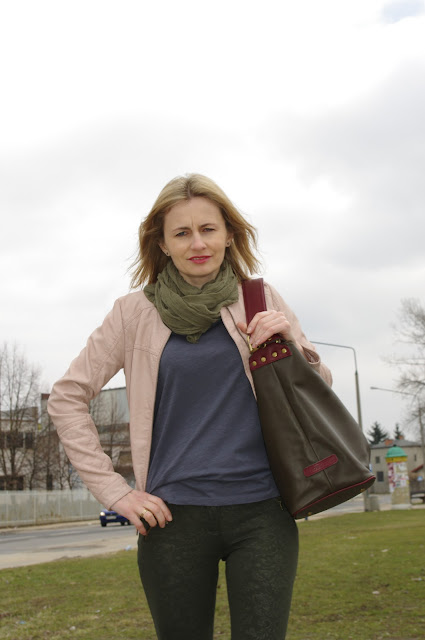 całotygodniowy wyjazd zapakowałam rzeczy dla siebie i dla męża w jedną walizkę. Pewnie wiecie, ile jest potrzebnych na wyjeździe rzeczy i prób usprawiedliwiania się i dlaczego aż tyle, dla mnie najczęstszymi są: bo pogoda może się zmienić, bo nie mogę codziennie wyglądać tak samo, bo ktoś pomyśli, że nie mam w co się ubrać, że dzisiaj znowu jestem w tym samym ubraniu itd. itp. Jednak po kolejnym wyjeździe i znoszeniu z 4 piętra kolejnej porcji walizek, laptopów, butów, materiałów do pracy, a po powrocie w środku nocy wnoszeniu tego z powrotem na górę, poszłam na kompromis ze sobą i zaczęłam tak dobierać garderobę aby tworzyć jeden zestaw podstawowy i tylko najczęściej jeden element zmienny, jednym razem jest to bluzka, innym spódnica, spodnie, w zależności od potrzeb. Oczywiście wszystko zależy również od tego iludniowy jest to wyjazd i jaki jest charakter wyjazdu, ale zwykle jeden zestaw to dwa dni. I właśnie dzisiaj prezentuję taki , gdzie zmienną częścią jest tylko t-shirt i biżuteria. Jak już kilka razy wspominałam są to zestawy, w których danego dnia można mnie zobaczyć, a nie zestaw tylko na potrzeby sesji do bloga, więc jest jeszcze odrobinę w wersji zimowej, ale mam nadzieję, że to już ostatni raz. Marzę o wiośnie, a przede wszystkim słonecznej pogodzie.